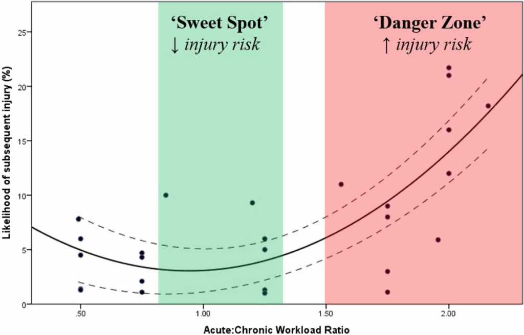 By calculating the Acute:Chronic Workload ratio, we can reduce the risk of injury to the athlete. The acute workload is the amount of load completed in 1 week of training, whereas chronic workload is the average workload performed in the previous 4 weeks.
